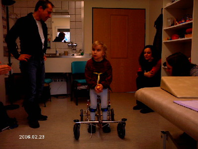 Hier mache ich meine ersten Gehversuche mit meinem Walker! Inzwischen kann ich schon ein paar Schritte an der Hand und immer an der Wand lang.....!
